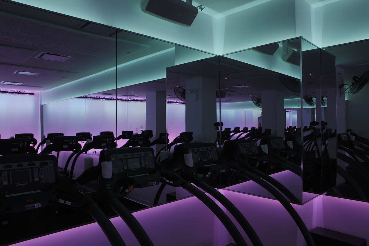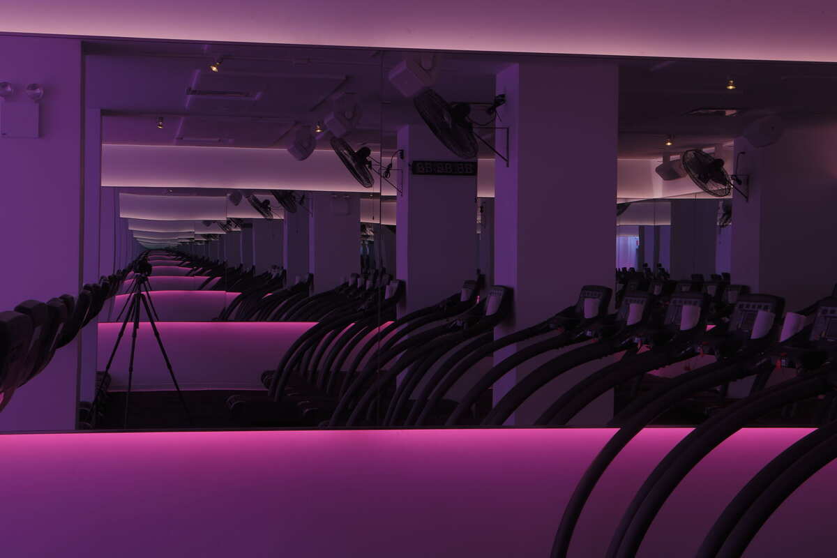 I designed the studio and its lighting system. Runners face a wall of mirrors with an illuminated rear wall behind them, so every person in the room is framed against a field of shifting color. The gradients change slowly across the session, tracking the narrative arc of each class — a warm build during the warmup, cooler tones through sustained effort, peaks of intensity at the summit. The reference was James Turrell more than any nightclub: light as atmosphere, not spectacle.