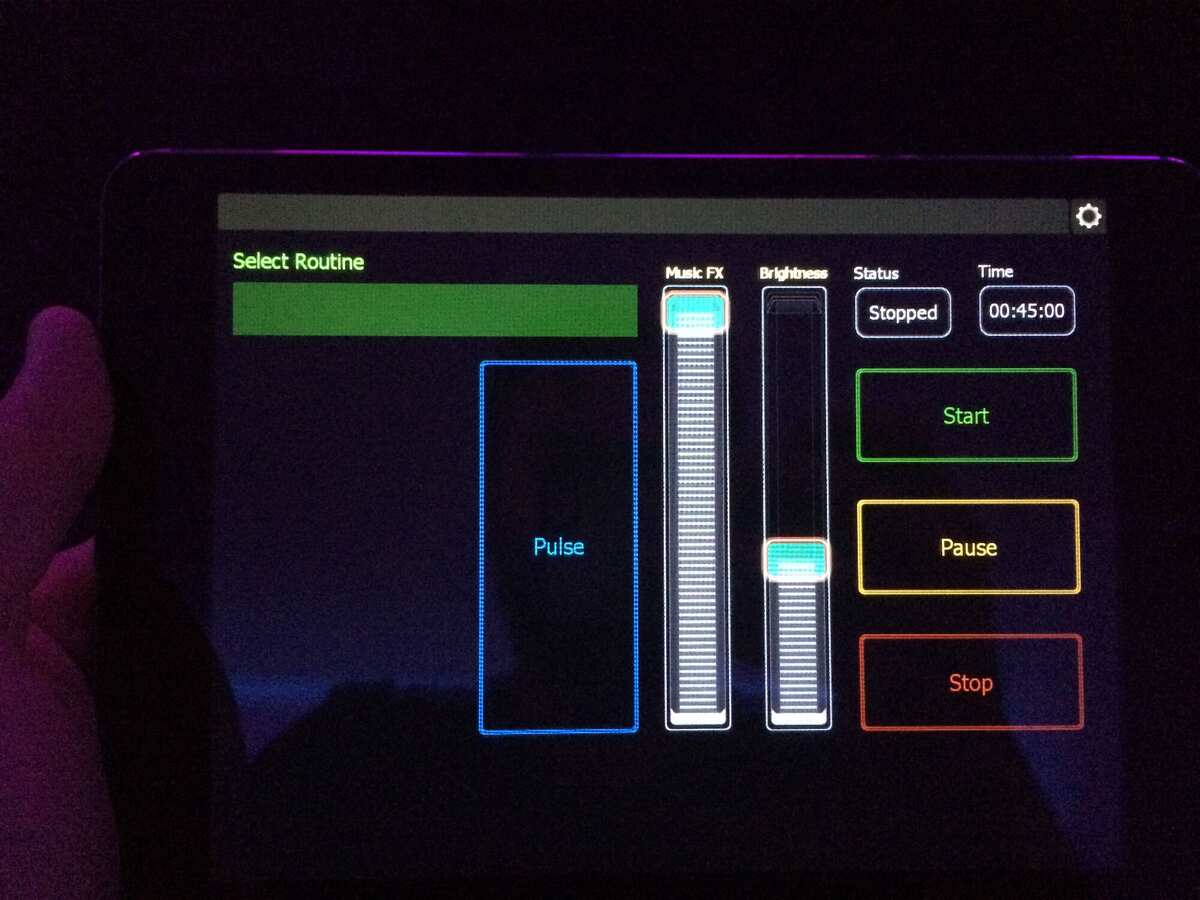 To give coaches control over this environment in real time, I designed a custom iPad control surface. Instructors can load scripted lighting programs that synchronize with the studio's music, dim or intensify the room, and trigger momentary pulses as visual pace cues — a flash on the beat to signal a speed change. The system also monitors the sound output and can auto-sync to the music's rhythm, so the lighting breathes with the playlist even when the coach isn't actively driving it.